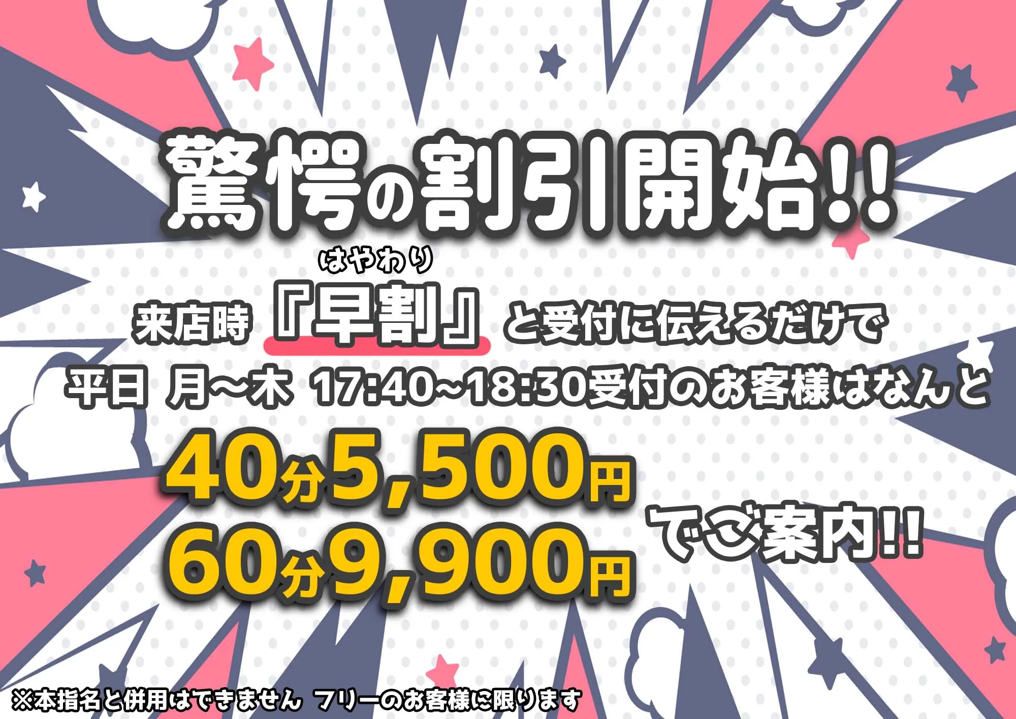 - 【早割】!! 月〜木 17時40分〜19時00分 受付でフリー限定 40分5500円 60分9900円 合言葉は【早割】とお伝え下さい!